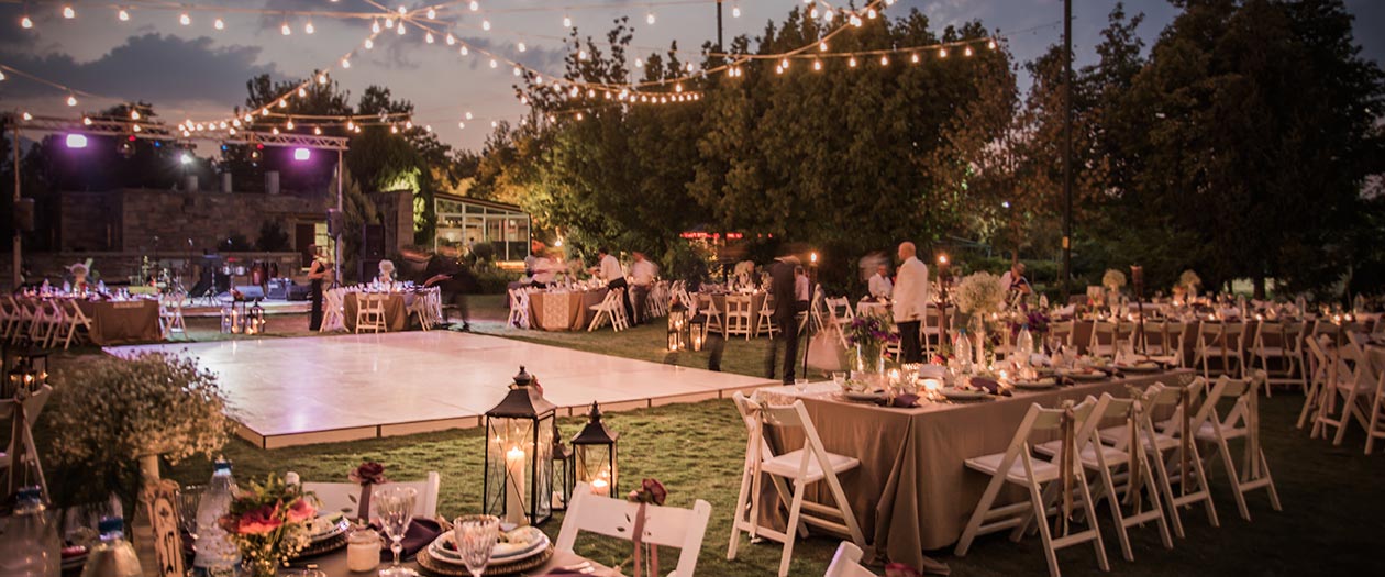• Zona de cină: Mesele pot fi aranjate sub cort sau sub cerul liber, lângă lumânări și ghirlande.