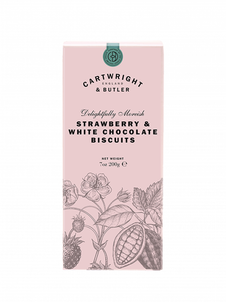 Biscuiti cu Ciocolata Alba si Capsuni 200g Cartwright & Butler Biscuiti crocanti si fragezi cu bucatele de capsuni si ciocolata alba fina…Textura delicata a biscuitilor contrasteaza perfect cu dulceata capsunilor si finetea ciocolatei albe.Bucura-te de aroma fructelor alaturi de ciocolata alba fina… un strop de cremozitate pentru o experienta completa.Facuti cu ingrediente de calitate superioara, acesti biscuiti sunt o alegere delicioasa, ideala pentru orice ocazie. Savure