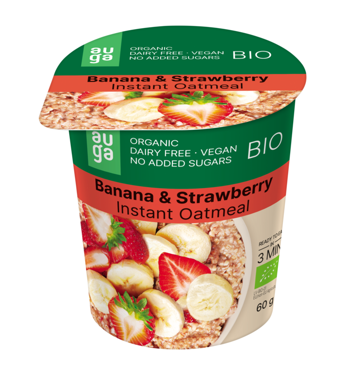 Ovaz integral BIO cu Banane si Capsuni 60G AugaAceasta portie de ovaz organica instantanee cu fructe si fructe de padure este bogata in fibre, fara lactate si fara zahar adaugat. Este preparata cu fulgi de ovaz organici cultivati in mod natural, utilizand tehnologii inovatoare si evitand cu strictete ingrasamintele chimice sau pesticidele.Aroma dulce a bananei se imbina armonios cu prospetimea capsunilor, creand o combinatie delicioasa si energizanta. Fulgii de ovaz ofera o textura cremoasa si o