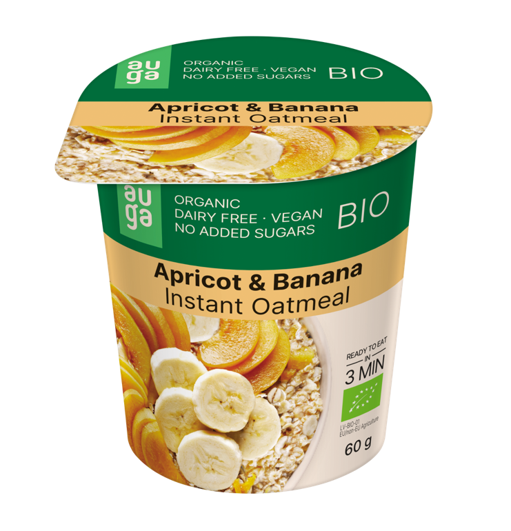 Ovaz integral BIO cu Caise si Banane 60G AugaAceasta portie de ovaz organica instantanee cu fructe si fructe de padure este bogata in fibre, fara lactate si fara zahar adaugat. Este preparata cu fulgi de ovaz organici cultivati in mod natural, utilizand tehnologii inovatoare si evitand cu strictete ingrasamintele chimice sau pesticidele.Aroma delicata a caiselor se imbina armonios cu aroma tropicala a bananei, creand o combinatie delicioasa si revigoranta. Fulgii de ovaz ofera o textura cremoasa