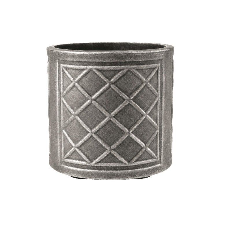 Ghiveciul este de culoare gri plumb, cu un design traditional.