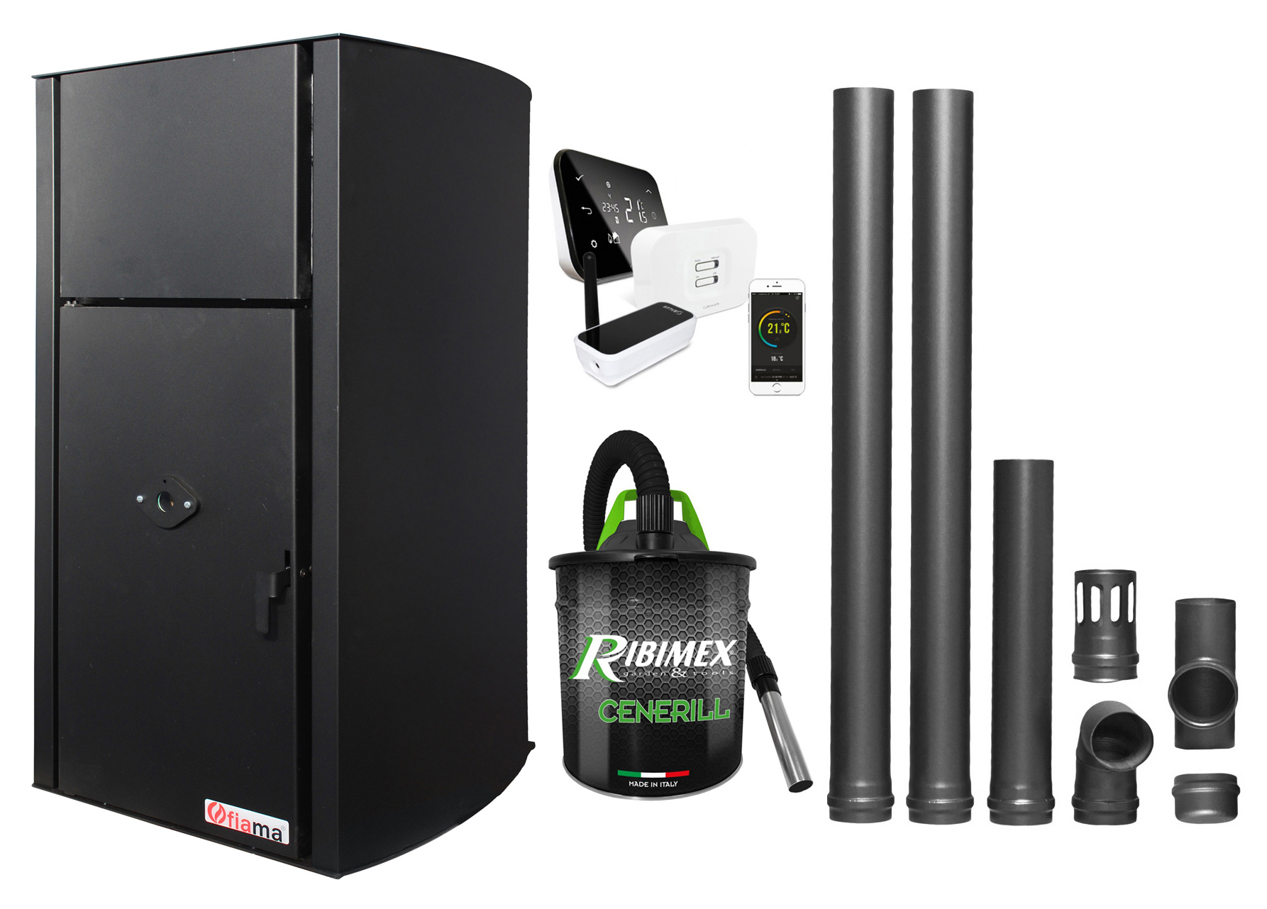 Pachet control de la distanta Centrala pe peleti Fornello Fiama Confort B 25 kw complet echipata pentru incalzire Pompa Vas expansiune Automatizare Termostat ambiental Salus IT 500 Aspirator Cenusa si Kit evacuare 2.5 ml
