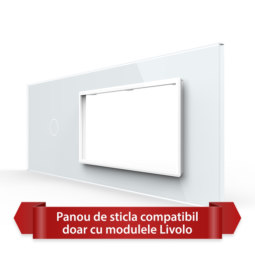 Panou intrerupator cu touch Livolo din sticla, standard Italian, simplu + doua prize, compatibil cu doza modulara de 6/7 module cu distanta dintre suruburi 102 mm. Produs compatibil doar cu modulele Livolo.Este rezistent la zgarieturi, umezeala, praf si ofera casei tale un plus de eleganta si rafinament.