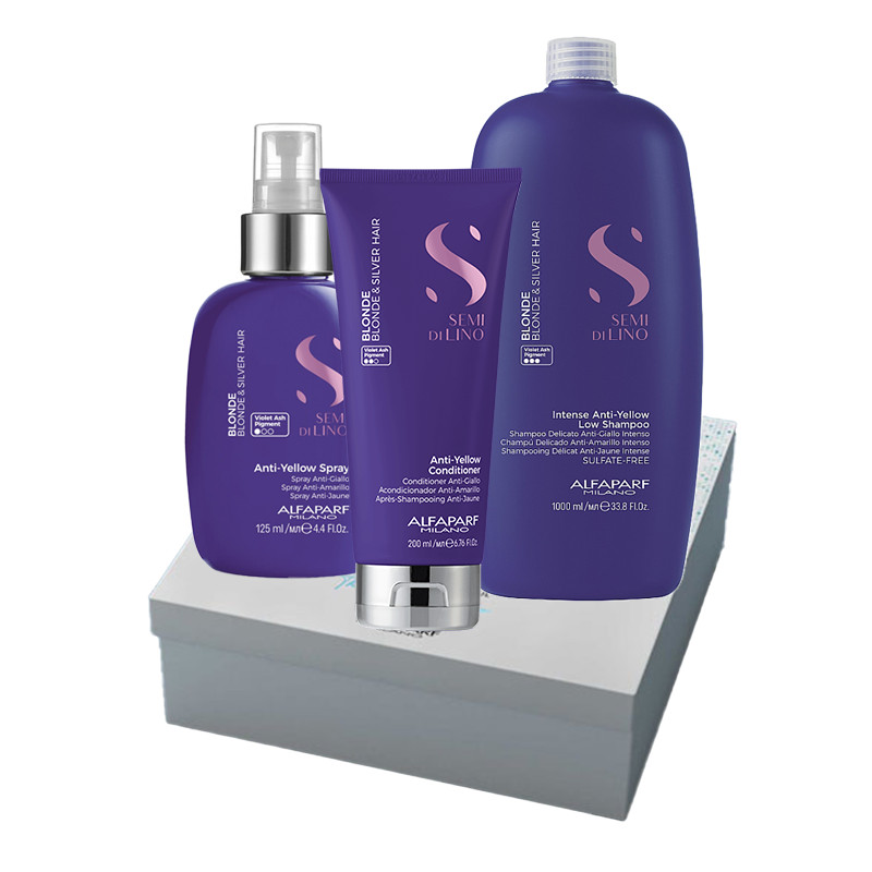 Setul contine: Sampon pentru neutralizarea tonurilor de galben 1000 ml Alfaparf Milano Semi Di Lino Blonde. Balsam pentru neutralizarea tonurilor de galben 200 ml Alfaparf Milano Semi Di Lino Blonde. Spray pentru neutralizarea tonurilor de galben 125 ml Alfaparf Milano Semi Di Lino Blonde. Semi di Lino Blonde este linia de tratament creată pentru a pune în valoare părul argintiu și blond, fie el natural sau decolorat. Neutralizează tonurile galbene nedorite, revigorează fibra capilară și oferă