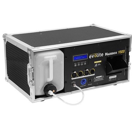 Modelul evolite HazeBox 1500 este un aparat de ceață pe bază de apă. Mașina are un rezervor de 2,5 litri care produce ceață în mod continuu, c