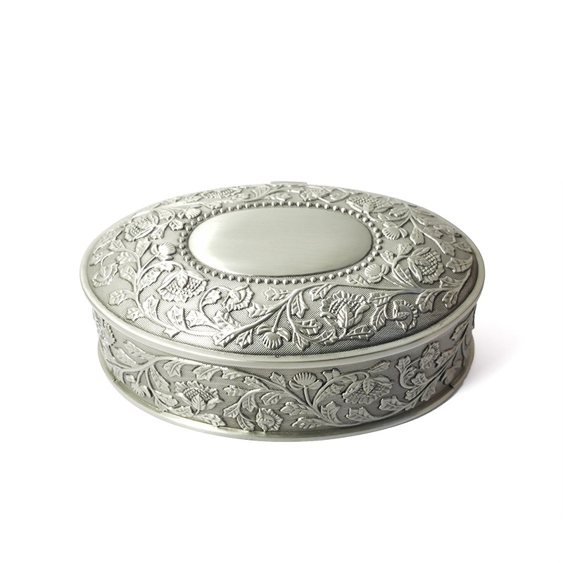 Această casetă pentru bijuterii din antimoniu cu formă ovală, culoare argintie și relief cu motive florale reprezintă modul perfect pentru a păstra bijuteriile preferate…
