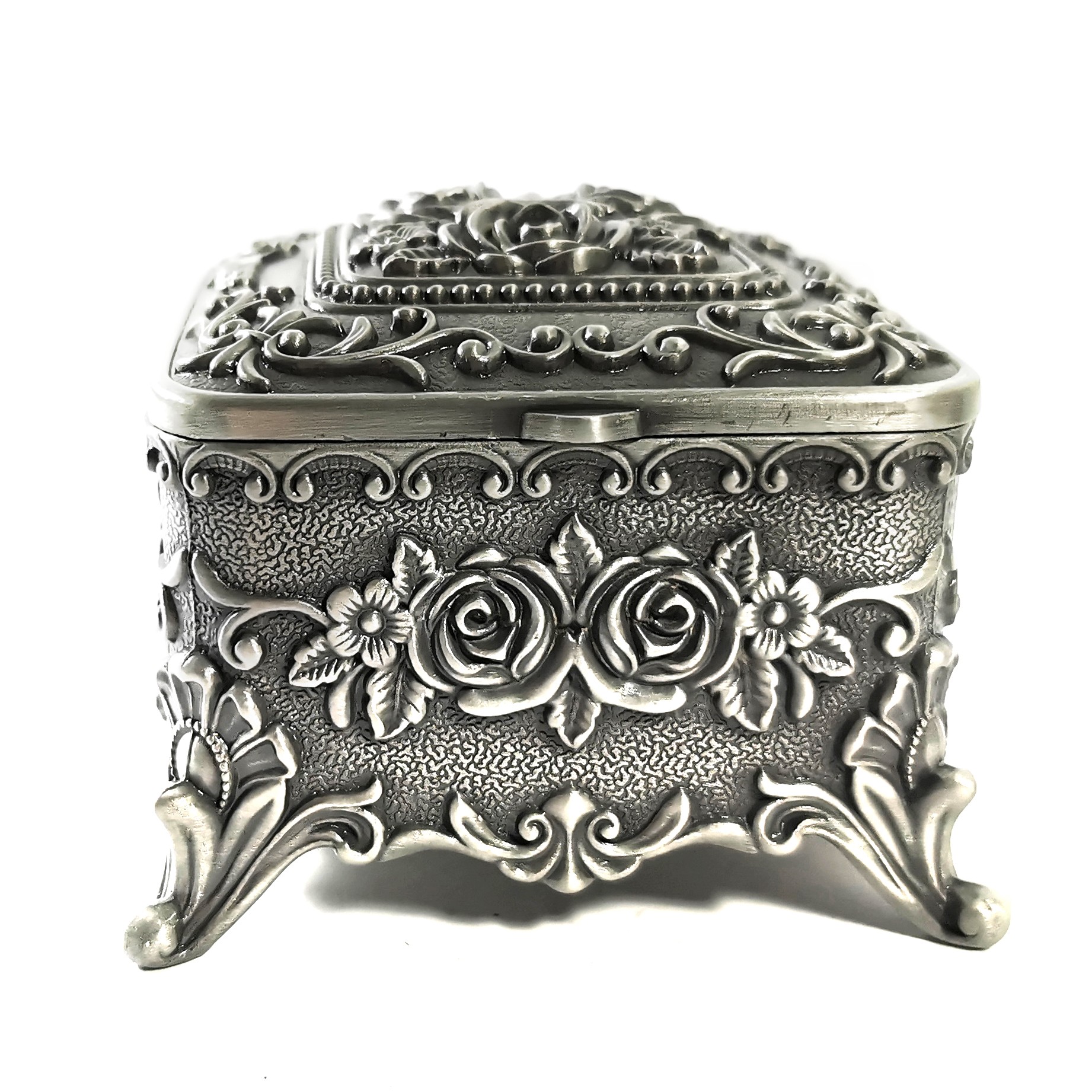 Această casetă pentru bijuterii din antimoniu cu formă patrata, culoare argintie și relief cu motive florale reprezintă modul perfect pentru a păstra bijuteriile preferate…
