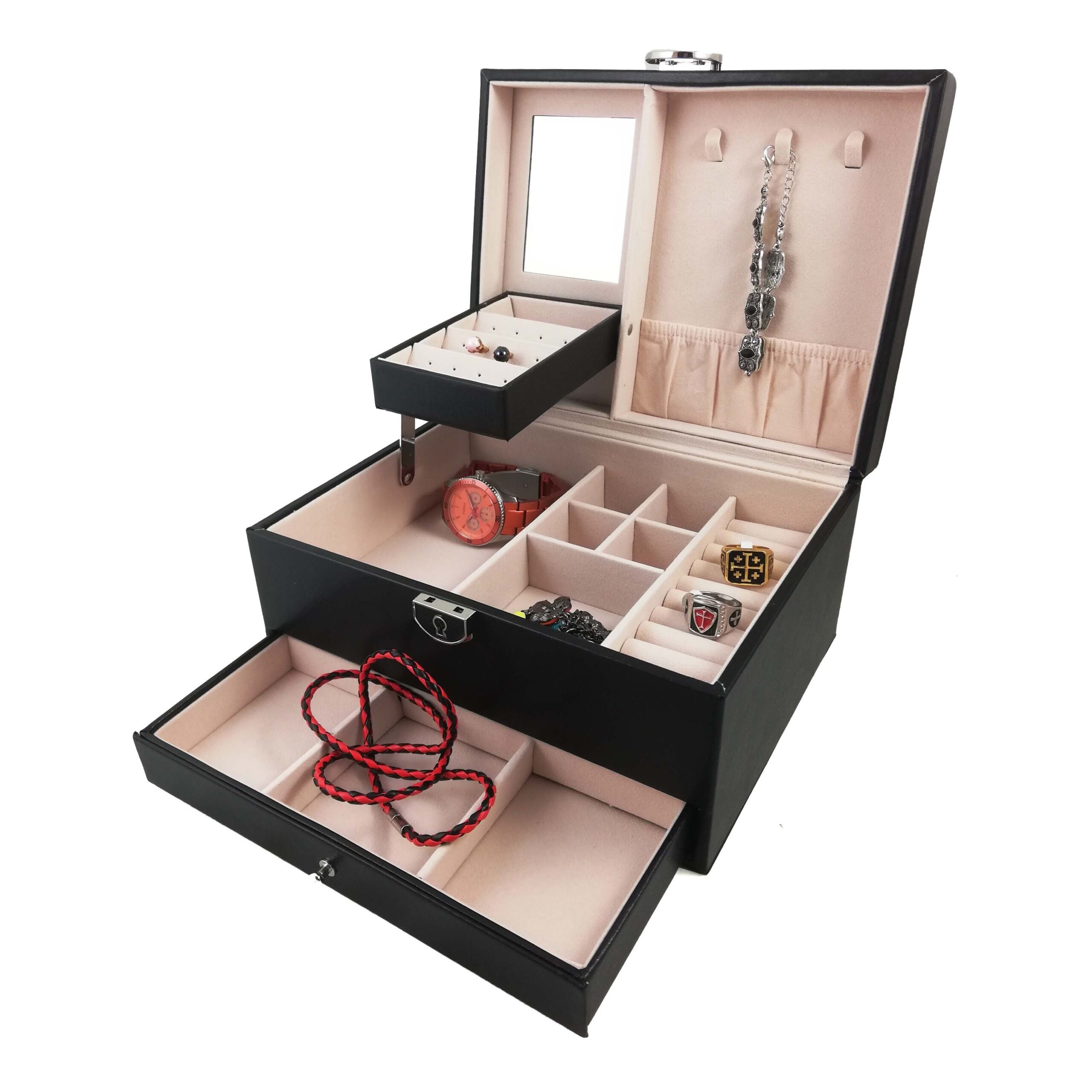 Caseta de bijuterii din piele ecologica cu spatii dedicate pentru bijuterii, inele, lanturi, butoni…
