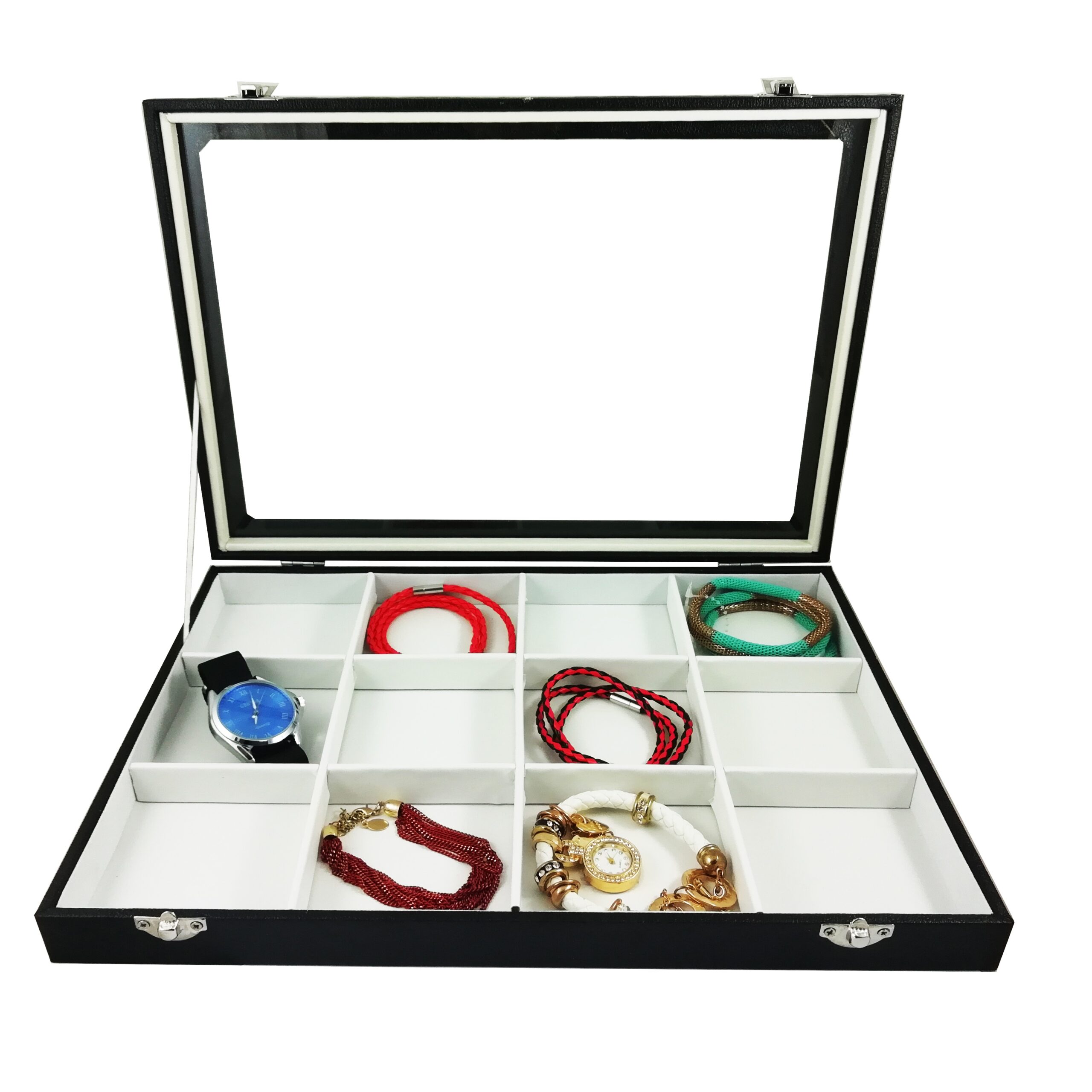 Caseta cu 12 spatii pentru prezentarea bijuteriilorRealizata din lemn, invelita la exterior in piele ecologica neagraInterior alb cu spatii generoas…
