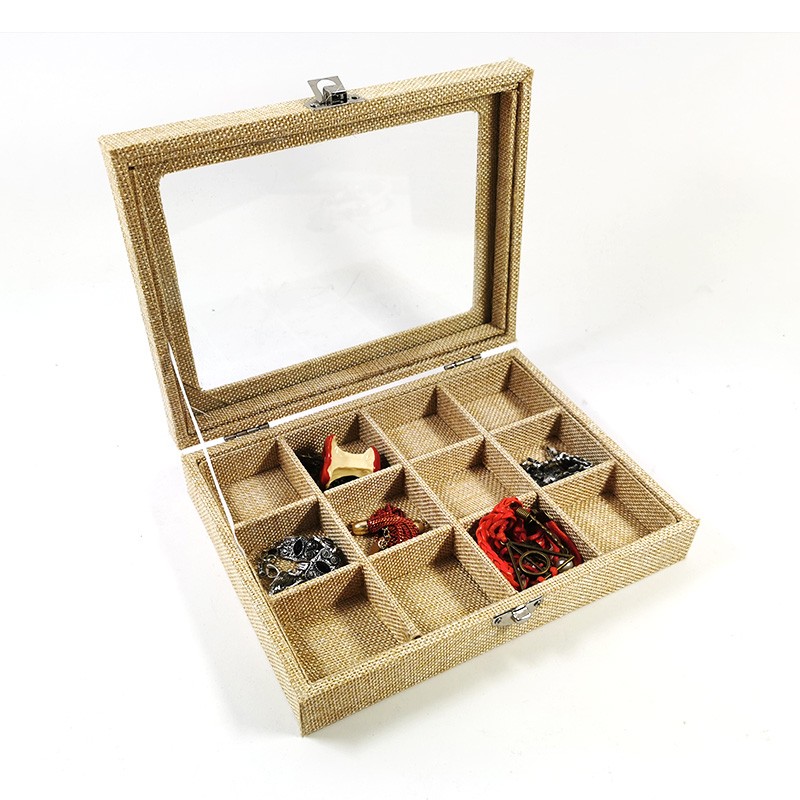 Caseta pentru bijuterii cu 12 spatiiInvelita in material textilCuloare BejCapac cu plexiglasDimensiuni redus…