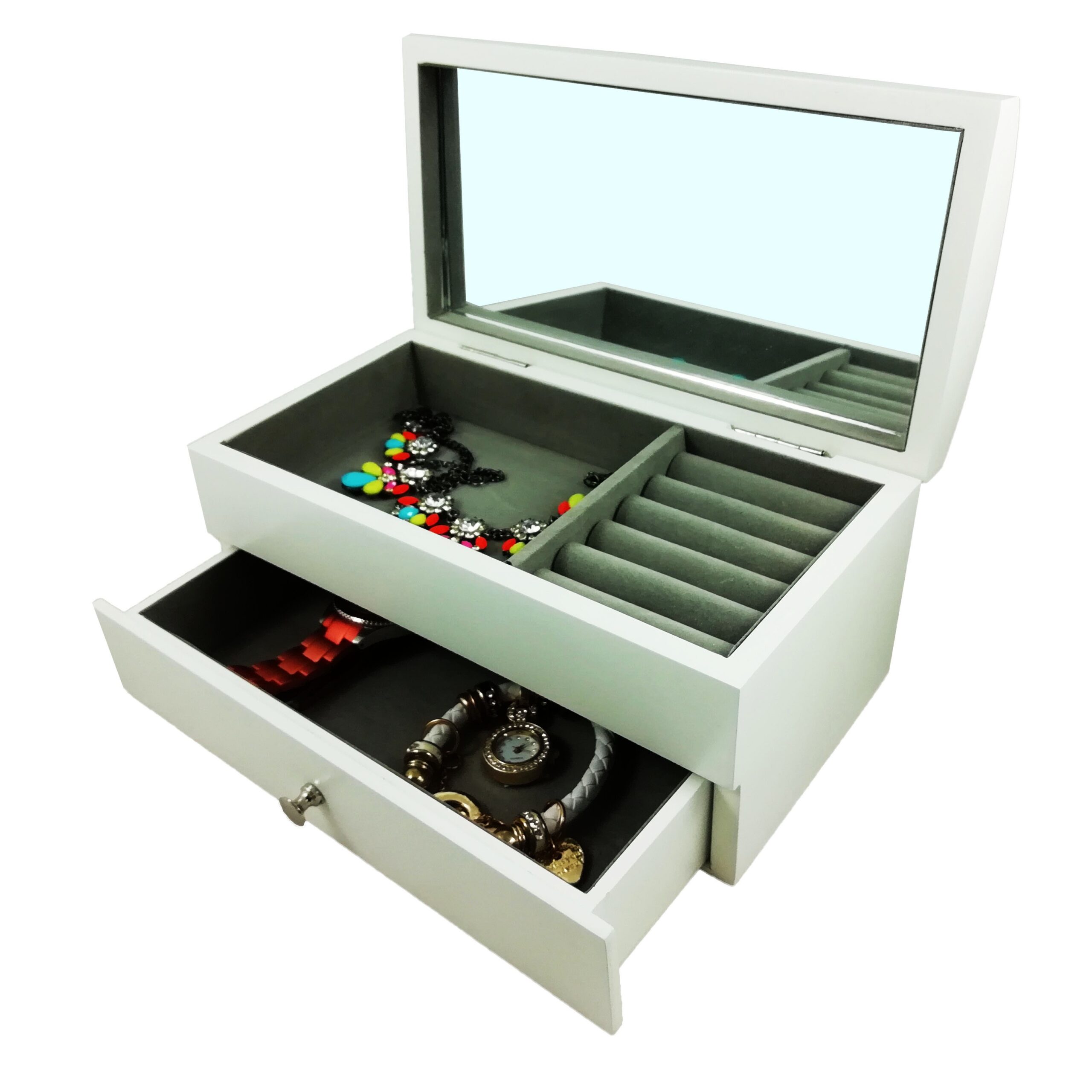 Casetă din lemn albSpații pentru bijuterii, inele, cercei, butoniPrevăzută cu olglind?…