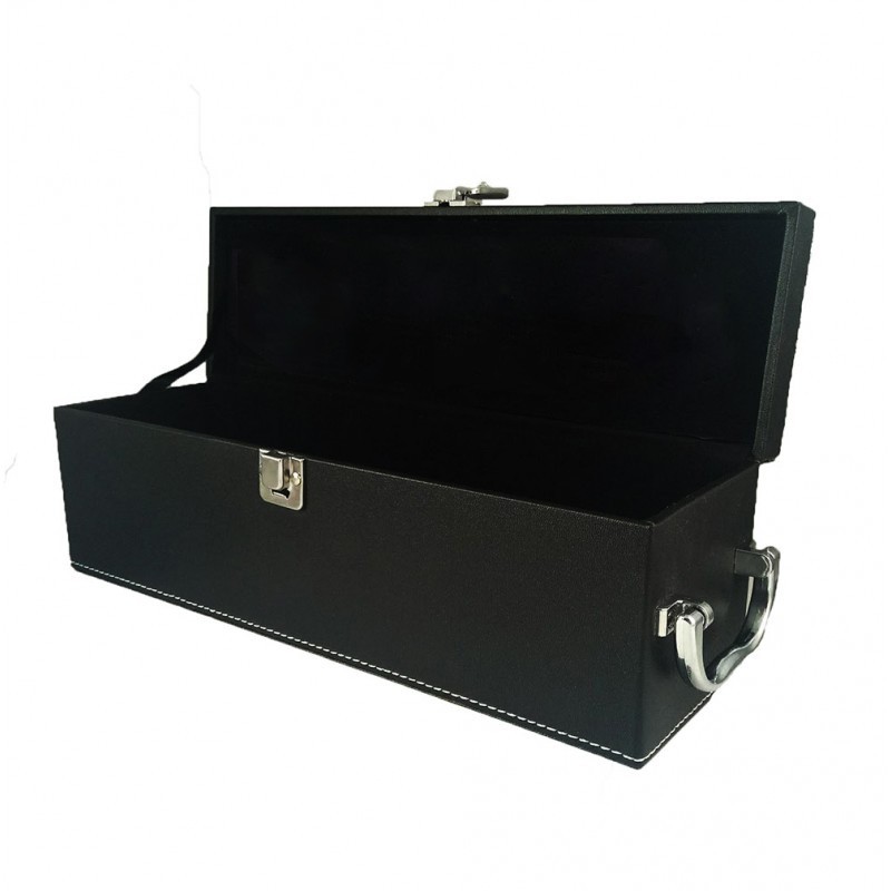 Cutie pentru o sticla de vin realizata din piele ecologica neagra, decorata cu o cusatura alba. Se inchide cu o clema, iar pe partea din dreapta are un maner pentru transport. Este un cadou ideal pentru iubitorii de vinuri…