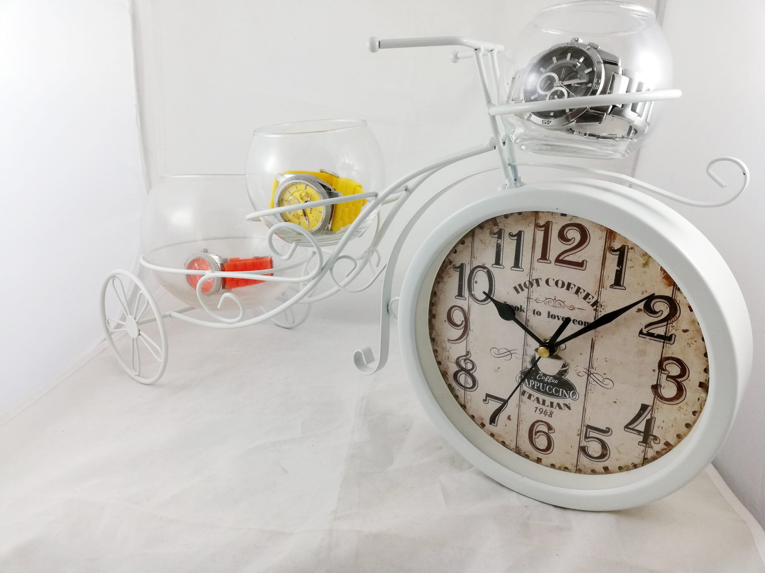 Ceas de masă a cărui formă este inspirată de modelul unei biciclete. Este realizat din aliaj metalic și este prevăzut cu trei boluri pentru diverse obiecte. Mecanismul tip Quartz al ceasului funcționează cu o baterie de 1,5 Volți…