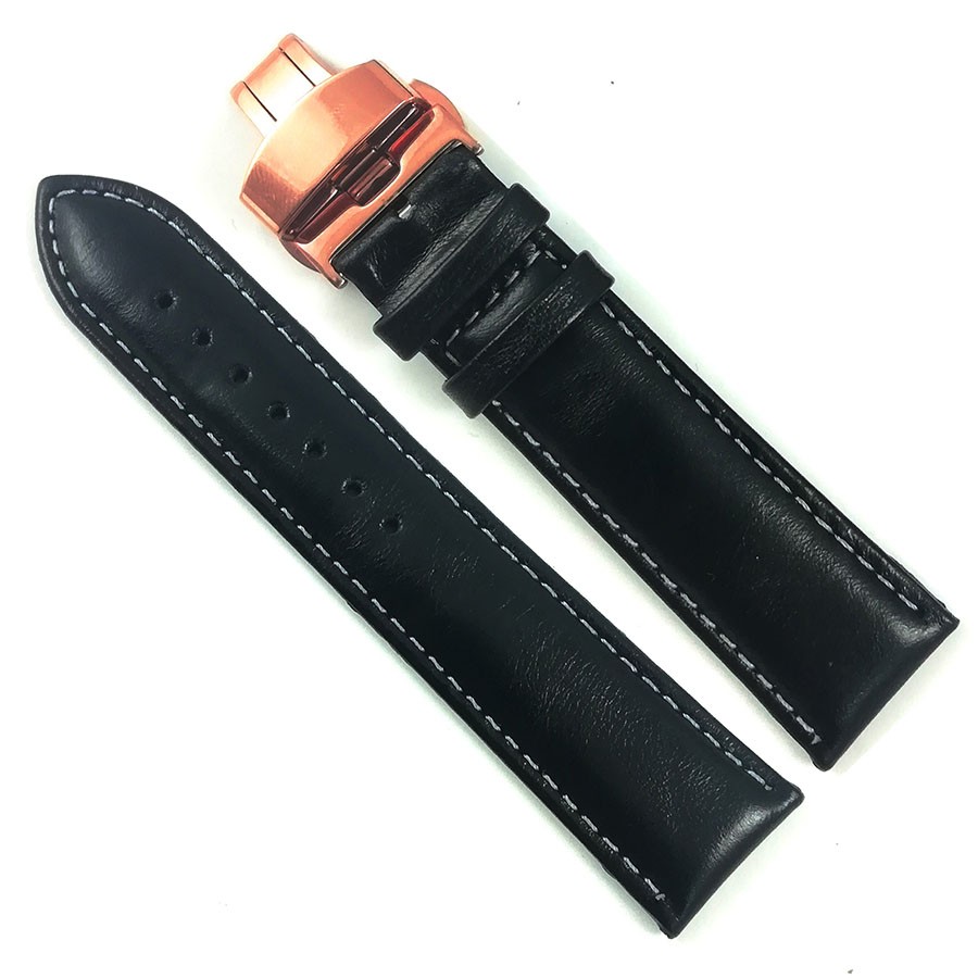 Curea ceas din piele neagra cu cusatura alba + Deployant auriu-roze 14mm 16mm 18mm 20mm 22mm 24mm