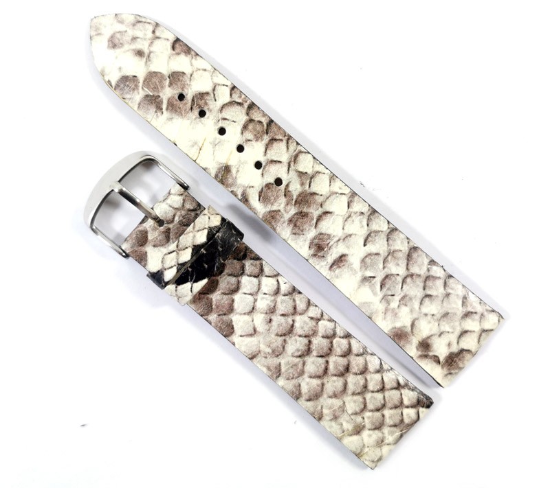 Curea de ceas din piele veritabila de sarpeRealizata din piele naturala la interior si piele de sarpe la exteriorCatarama clasica din otel inoxidabil de culoare argintie -Hand Made-MADE IN ROMANI…