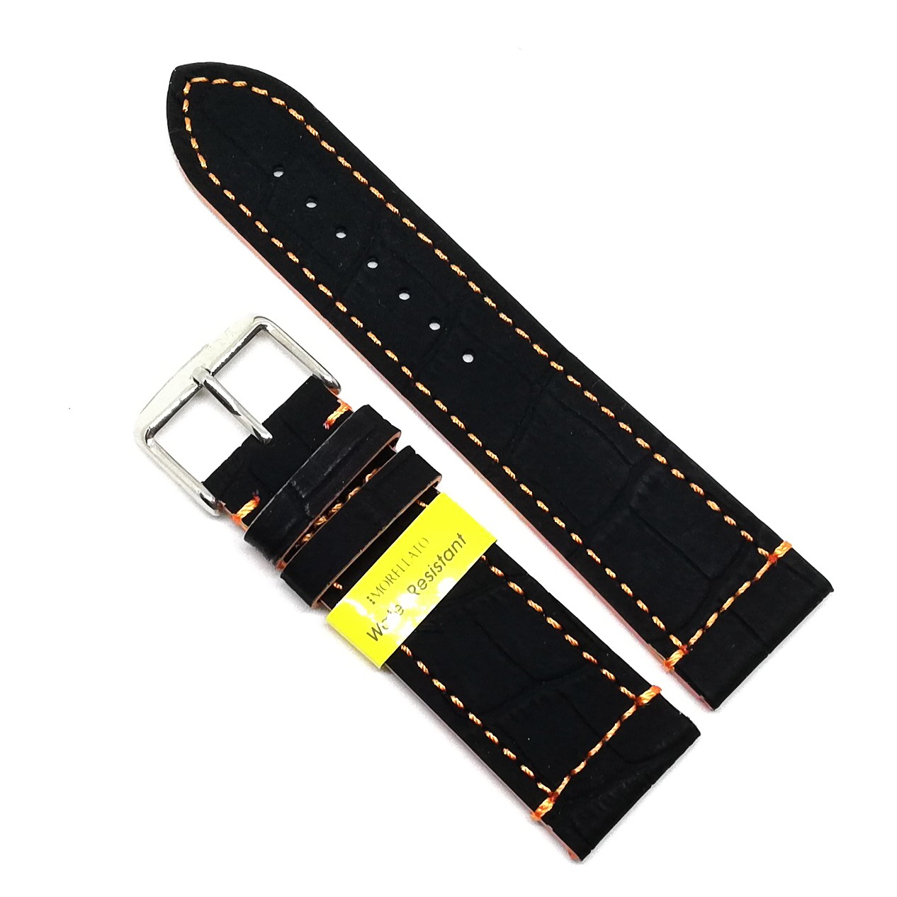 Curea pentru ceas din pvc flexibilCuloare neagra si cusatura portocalieTextura mata si imprimeu crocodilCatrama inoxidabila argintieMade in Ital…