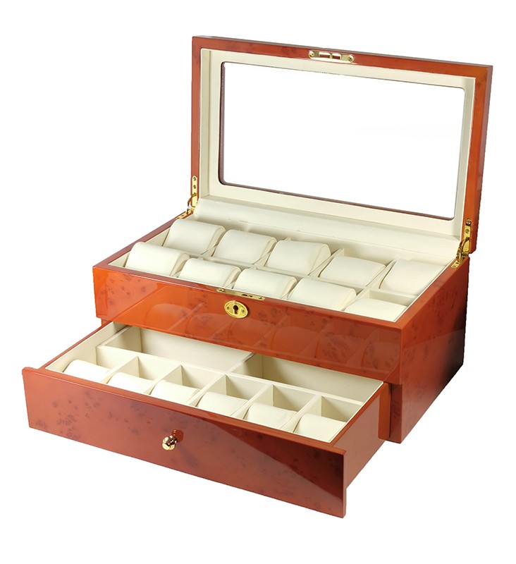 Cutie pentru ceasuri realizata din lemnFinisaj lucios, lacuitFeronerie aurieInterior piel…