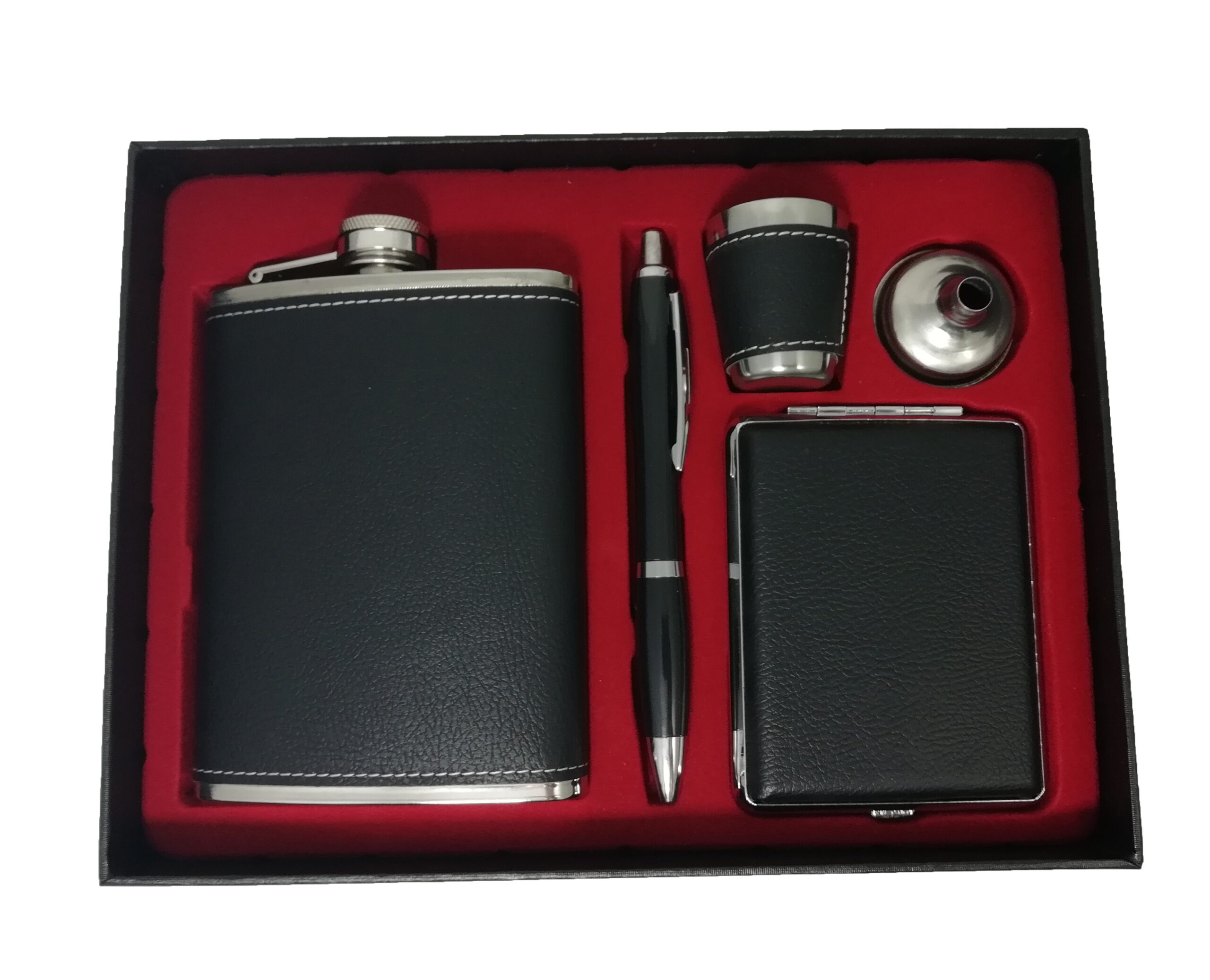 Setul conține o ploscă mare, o tabacheră, un pahar pentru tărie o pâlnie și un pix. Produsele sunt realizate din oțel inoxidabil și învelite în piele ecologică de culoare neagră. Ele sunt protejate într-o cutie cu interiorul din burete du…