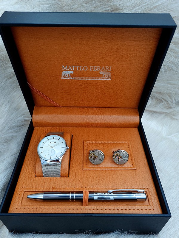 Cadou ideal pentru orice pasionat de ceasuriCeas Matteo Ferari, Butoni in forma de mecanism de ceas si pixCutie de pastrare cadou…