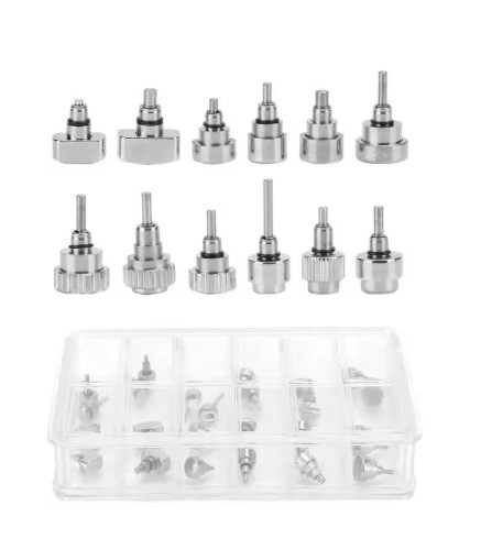 Set profesional de 24 butoane (pushere) din oțel inoxidabil, 12 modele asortate. Soluția ideală pentru reparații precise de carcase și cronografe, oferind durabilitate și rezistență la coroziune. Vă invităm în showroom-ul nostru din Intrare…