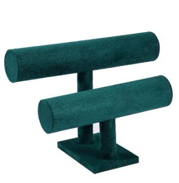 Stativ pentru expunerea si prezSuport dublu pentru brățări și ceasuri, realizat din material catifelat în nuanță elegantă de verde smarald / verde petrol (teal închis). Ideal pentru organizarea și expunerea accesoriilor, oferind un aspect pr…