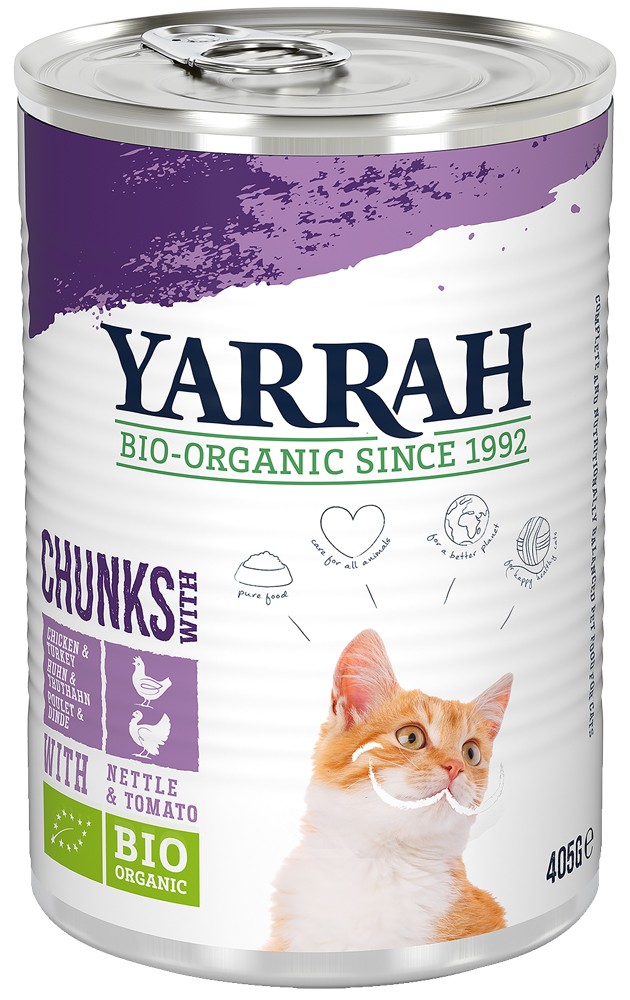Hrana umeda bio pentru pisici, bucati de pui si curcan cu urzica si tomate, 405g Yarrah