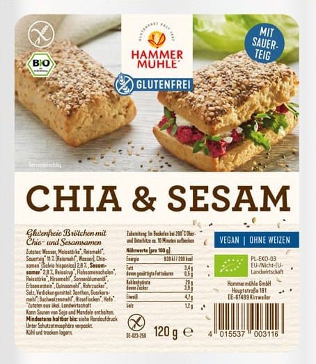 Chifle fara gluten cu seminte de chia si susan, 120g, Hammer Muhle