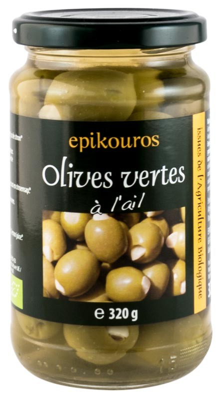 Masline verzi bio umplute cu usturoi in saramura, 320g Epikouros