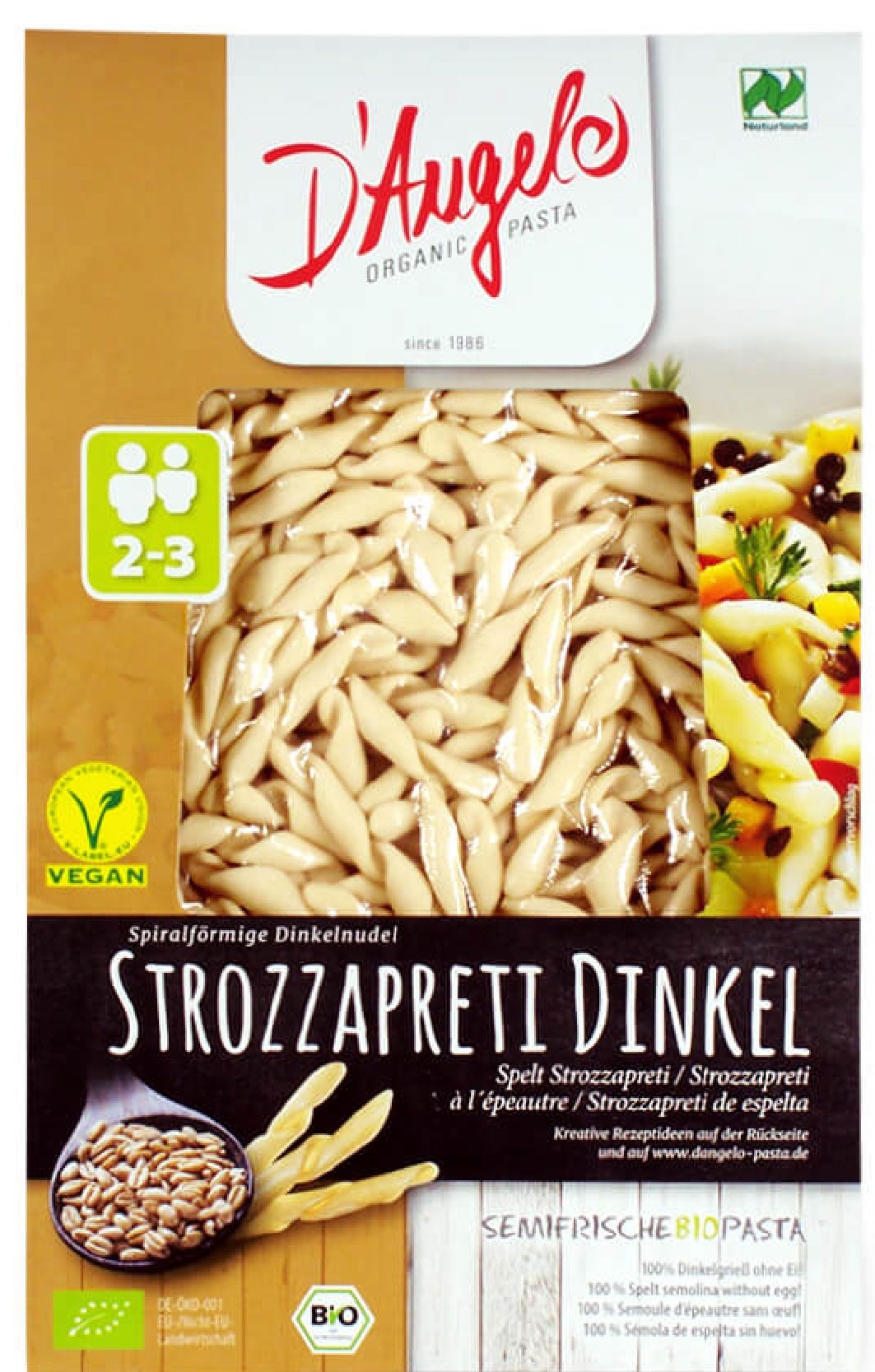 Descoperiți delicioasele paste „D’Angelo”! Indiferent dacă au forma de cappelletti, tortellini, ravioli sau strozzapreti – încântați-vă simțurile cu gustul autentic italian al acestor semipreparate exclusiv din ingrediente ecologice vegane și sustenabile. Umpluți cu arome delicioase de legume proaspete și condimente alese cu grijă, sau cu tofu, brânză vegan, spanac, roșii, ciuperci sau ricotta – aceste paste vegane vor fi o alegere perfectă pentru o masă rapidă și delicioasă, plină de savoare și sănătate. Experimentați bucuria pastelor italiene tradiționale, într-o variantă vegană, cu gama „D’Angelo”.
