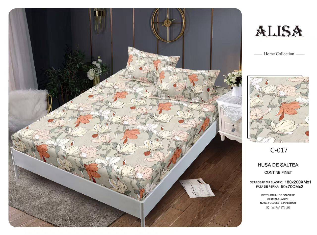HUSA DE PAT cu elastic +2 FETE PERNA Husele de pat sunt ideale pentru orice tip de saltea. Materiale sunt foarte usor de intretinut cu conditia respectarii instructiunilor de ingrijire, intensitatea culorilor persistand chiar si dupa spalare frecventa Oricat de agitat esti in timpul somnului,cearceaful ramane la locului. Setul contine: Cearsaf cu elastic 180X200 cm 2 fete de perna-70X50 cm Compozitie material: bumbac 50%+PES 50% ATENTIE :Produsele sunt destinate saltelelor INTRE 140*200C