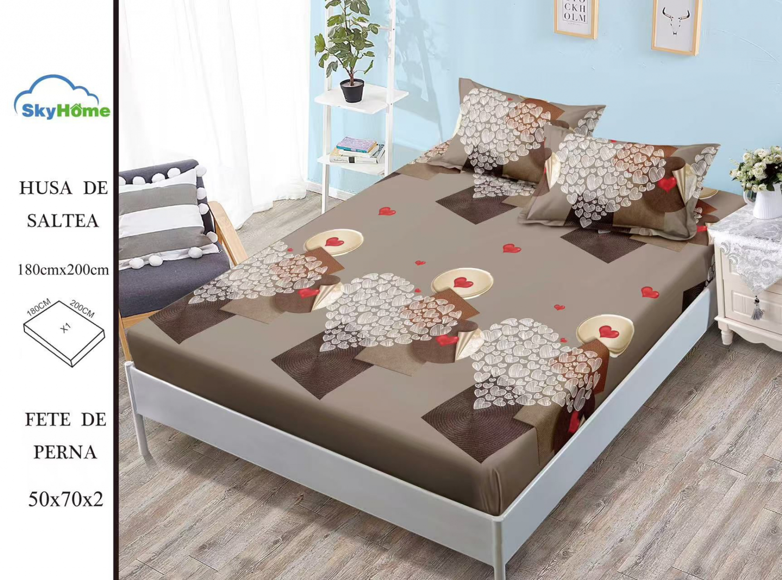 HUSA DE PAT cu elastic +2 FETE PERNA Husele de pat sunt ideale pentru orice tip de saltea. Materiale sunt foarte usor de intretinut cu conditia respectarii instructiunilor de ingrijire, intensitatea culorilor persistand chiar si dupa spalare frecventa Oricat de agitat esti in timpul somnului,cearceaful ramane la locului. Setul contine: Cearsaf cu elastic 180X200 cm 2 fete de perna-70X50 cm Compozitie material: bumbac 50%+PES 50% ATENTIE :Produsele sunt destinate saltelelor INTRE 140*200C