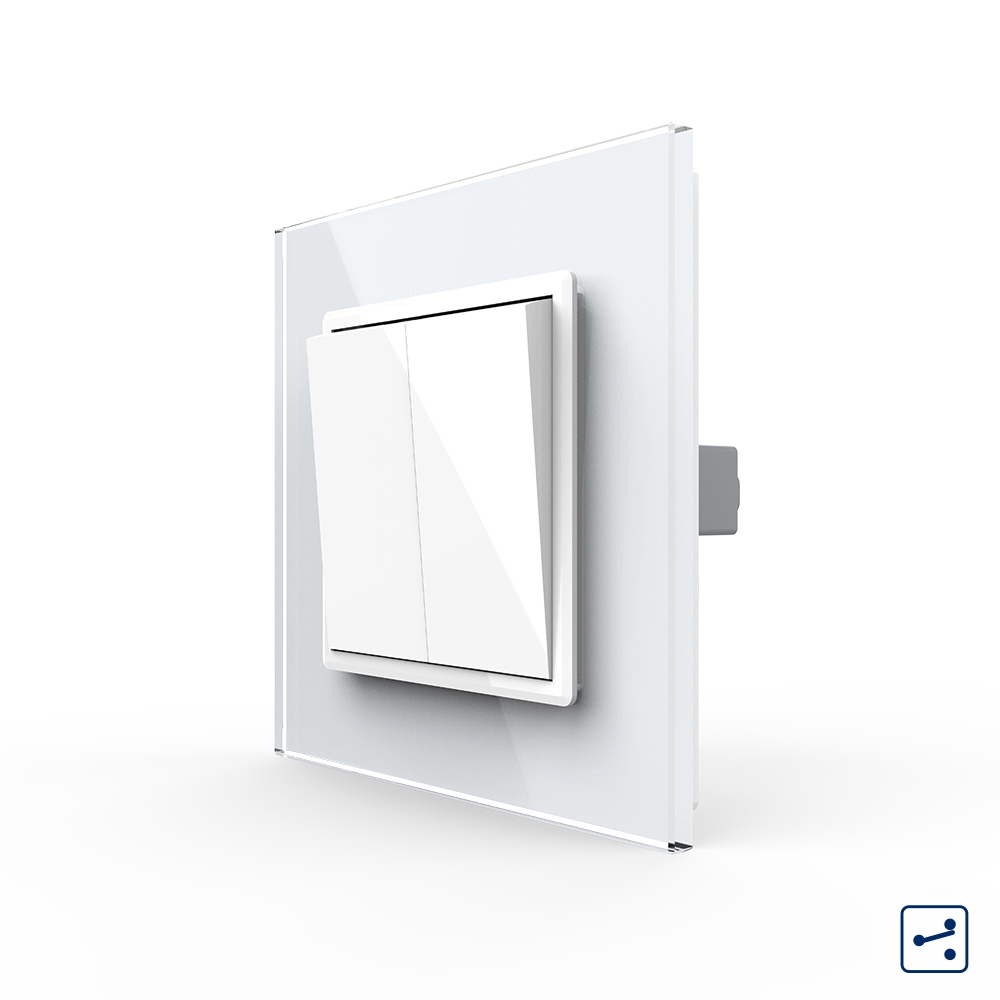 Intrerupator dublu mecanic cu rama din sticla Livolo. Produsul este compatibil cu ramele din sticla pentru doze standard german sau doze modulare italiene. Poate fi folosit ca intrerupator cap scara