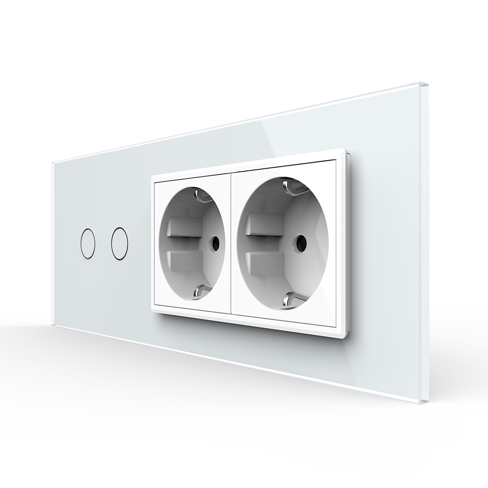 Intrerupator dublu + doua prize Livolo din sticla, standard italian, cu 6 module, din sticla crystal securizata, termorezistenta, compatibil doar cu modulele Livolo. Este rezistent la zgarieturi, umezeala, praf si ofera casei tale un plus de eleganta si rafinament.