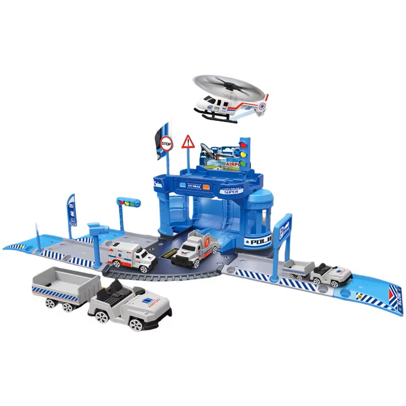 Set parcare politie cu elicopter, masini si harta de joc, 37 piese – un centru complet de interventie pentru micii agenti de ordine Acest set de parcare politie cu 37 de piese recreeaza atmosfera captivanta a unei baze moderne de interventie, unde copiii pot coordona misiuni, pot dirija traficul si pot raspunde rapid situatiilor de urgenta. Statia centrala, realizata in nuante de albastru specifice politiei, este prevazuta cu rampe, porti de acces si spatii special concepute pentru ca