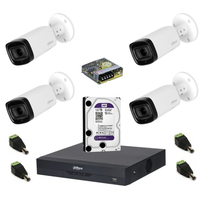 Sistem complet de supraveghere Dahua DH-4CEXT60M-5MP HDCVI cu 4 camere de exterior de 5MP, IR 60m, zoom motorizat 2.7-12mm, microfon