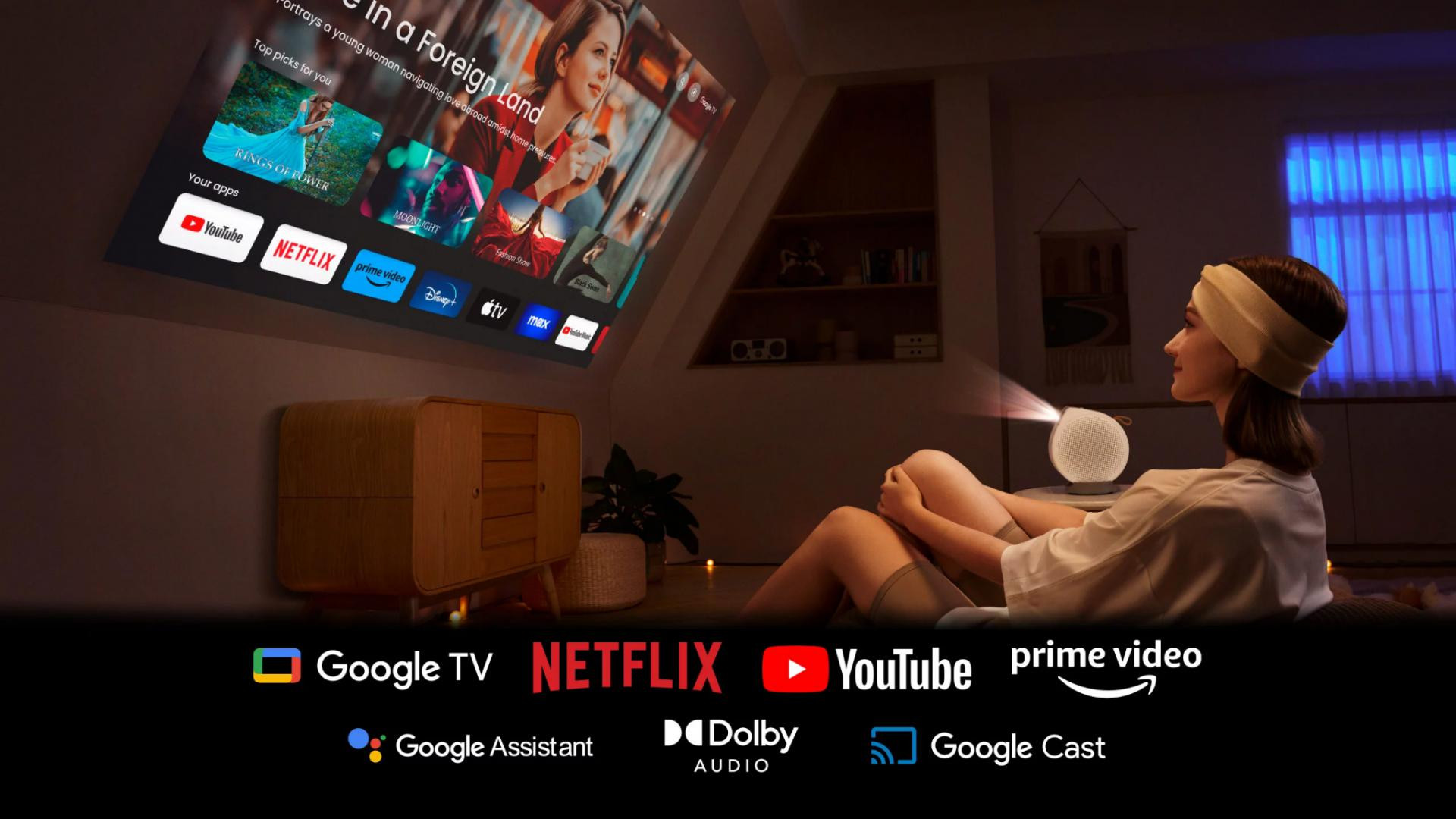 Videoproiector BenQ GV50, FHD 1920* 1080, up to 4K UHD (3840 x 2160), laser 20.000-30.000 ore, 500 ANSI lumeni, 16:9, 100.000:1, HDR, HLG, HDMI, USB Type A-1 (2.0/Power Supply1.0A/Reader/FW Upgrade), USB tip C, boxe 2* 4W, Woofer Cameră 10W, audio out, telecomanda cu baterie inclusa, cablu alimentare 1.8m, Smart Home, Google TV (Android 11), Bluetooth 5.0, 802,11 a/b/g/n/ac (2,4G/5G), AirPlay, Google Cast, 2.1 kg, Design flexibil similar cu un trepied incorporat adaptat pentru proiectia pe tavan