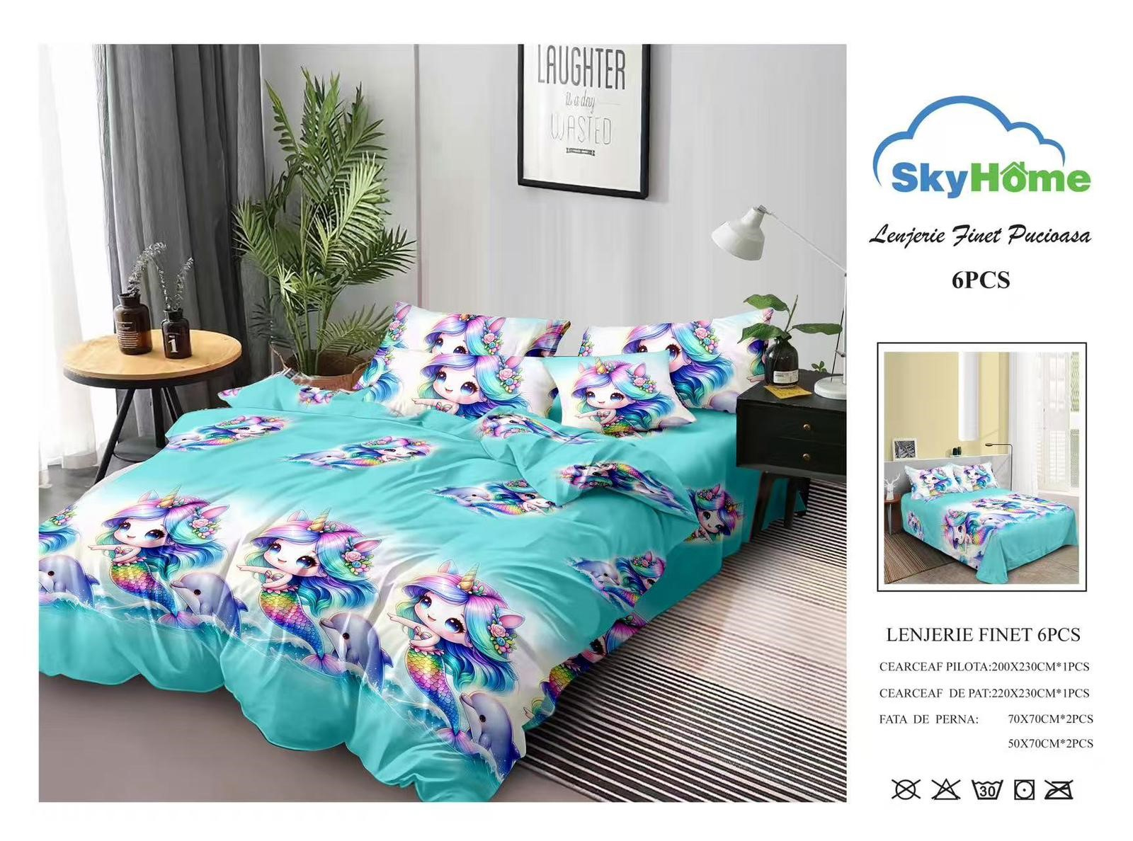 Materialul din care este confectionată lenjeria este de calitate superioara cu o textură fină, moale și foarte placută la atingere. GARANTAT NU SE DECOLOREAZA DACĂ SE RESPECTĂ INSTRUCȚIUNILE DE INTREȚINERE. Produsul este ambalat in husa de plastic transparenta.   Pachetul conține: – cearsaf de pat: 230 x 220 cm ±10cm – cearsaf de pilota: 200 x 220 cm ±10cm – fata perna (2 buc): 50 x 70 cm ±10cm – fata perna (2