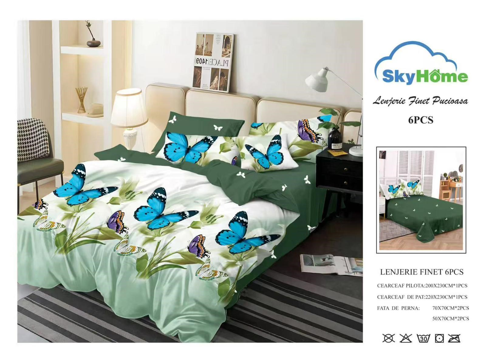 Materialul din care este confectionată lenjeria este de calitate superioara cu o textură fină, moale și foarte placută la atingere. GARANTAT NU SE DECOLOREAZA DACĂ SE RESPECTĂ INSTRUCȚIUNILE DE INTREȚINERE. Produsul este ambalat in husa de plastic transparenta.   Pachetul conține: – cearsaf de pat: 230 x 220 cm ±10cm – cearsaf de pilota: 200 x 220 cm ±10cm – fata perna (2 buc): 50 x 70 cm ±10cm – fata perna (2
