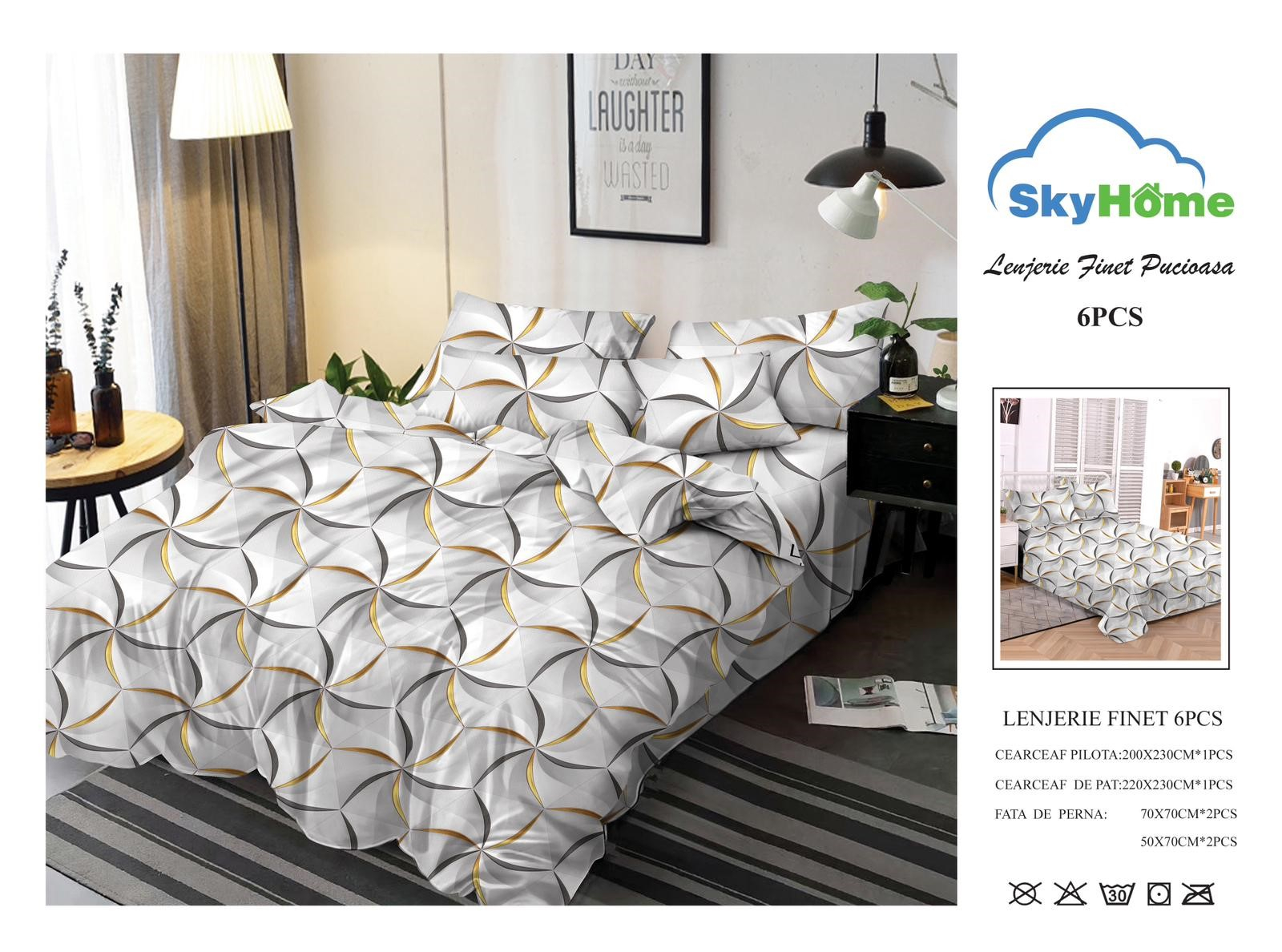 Materialul din care este confectionată lenjeria este de calitate superioara cu o textură fină, moale și foarte placută la atingere. GARANTAT NU SE DECOLOREAZA DACĂ SE RESPECTĂ INSTRUCȚIUNILE DE INTREȚINERE. Produsul este ambalat in husa de plastic transparenta.   Pachetul conține: – cearsaf de pat: 230 x 220 cm ±10cm – cearsaf de pilota: 200 x 220 cm ±10cm – fata perna (2 buc): 50 x 70 cm ±10cm – fata perna (2