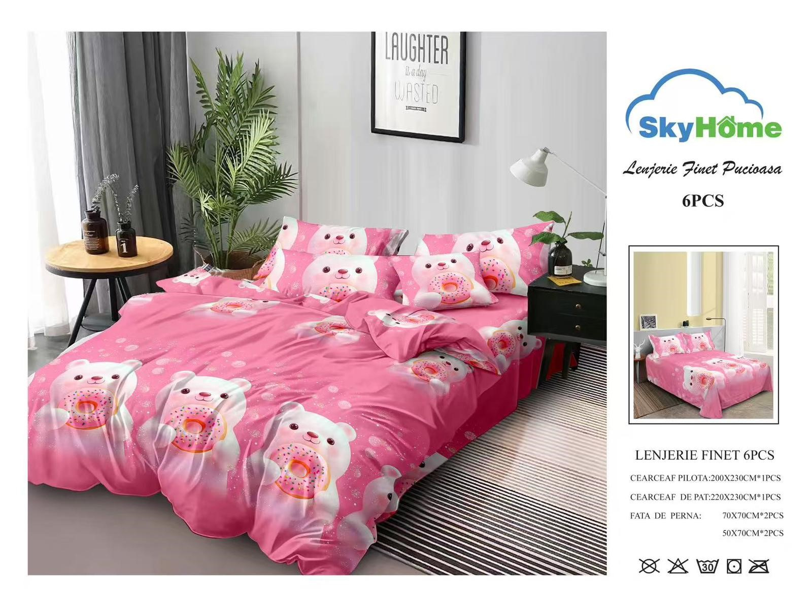 Materialul din care este confectionată lenjeria este de calitate superioara cu o textură fină, moale și foarte placută la atingere. GARANTAT NU SE DECOLOREAZA DACĂ SE RESPECTĂ INSTRUCȚIUNILE DE INTREȚINERE. Produsul este ambalat in husa de plastic transparenta.   Pachetul conține: – cearsaf de pat: 230 x 220 cm ±10cm – cearsaf de pilota: 200 x 220 cm ±10cm – fata perna (2 buc): 50 x 70 cm ±10cm – fata perna (2