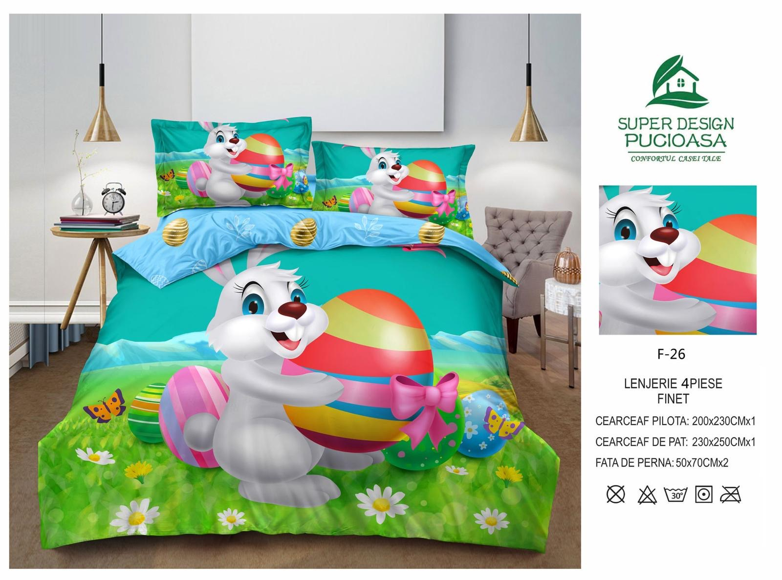 Materialul din care este confectionată lenjeria este de calitate superioara cu o textură fină, moale și foarte placută la atingere. GARANTAT NU SE DECOLOREAZA DACĂ SE RESPECTĂ INSTRUCȚIUNILE DE INTREȚINERE. Produsul este ambalat in husa de plastic transparenta.   Pachetul conține: – cearsaf de pat: 230 x 220 cm ±10cm – cearsaf de pilota: 200 x 220 cm ±10cm – fata perna (2 buc): 50 x 70 cm ±10cm    Co