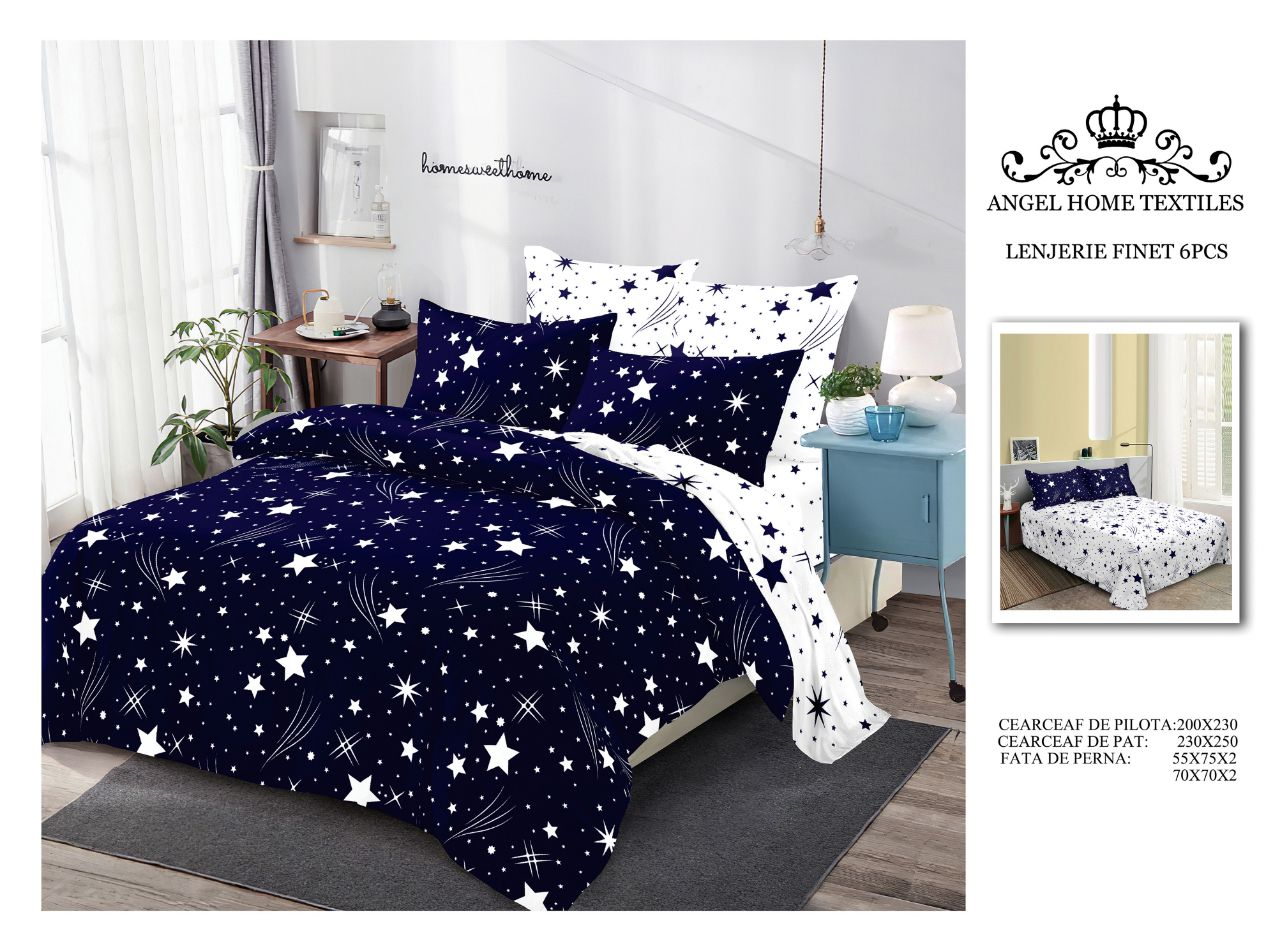 Materialul din care este confectionată lenjeria este de calitate superioara cu o textură fină, moale și foarte placută la atingere. GARANTAT NU SE DECOLOREAZA DACĂ SE RESPECTĂ INSTRUCȚIUNILE DE INTREȚINERE. Produsul este ambalat in husa de plastic transparenta.   Pachetul conține: – cearsaf de pat: 230 x 220 cm ±10cm – cearsaf de pilota: 200 x 220 cm ±10cm – fata perna (2 buc): 50 x 70 cm ±10cm – fata perna (2