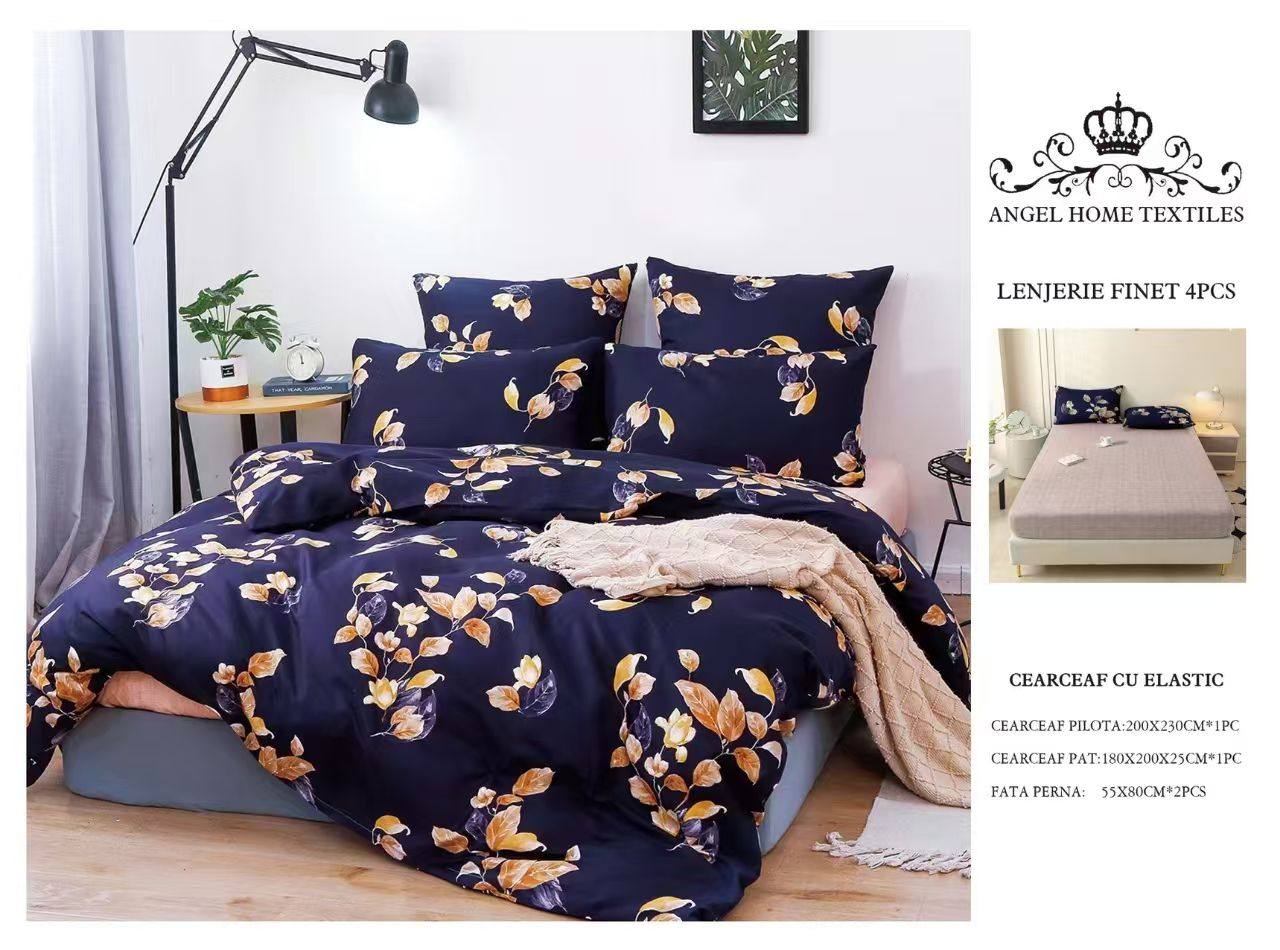 Materialul din care este confectionată lenjeria este de calitate superioara cu o textură fină, moale și foarte placută la atingere. GARANTAT NU SE DECOLOREAZA DACĂ SE RESPECTĂ INSTRUCȚIUNILE DE INTREȚINERE. Produsul este ambalat in husa de plastic transparenta.   Pachetul conține: 1 x Cearceaf pilota: 200 x 230 cm; 1 x Cearceaf de pat: 180 x 200 cm;- CU ELASTIC 2 x Fata de perna: 50 x 70 cm. Lenjeria este ideala pentr