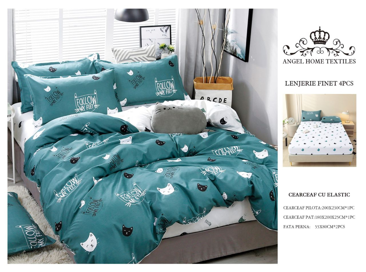 Materialul din care este confectionată lenjeria este de calitate superioara cu o textură fină, moale și foarte placută la atingere. GARANTAT NU SE DECOLOREAZA DACĂ SE RESPECTĂ INSTRUCȚIUNILE DE INTREȚINERE. Produsul este ambalat in husa de plastic transparenta.   Pachetul conține: 1 x Cearceaf pilota: 200 x 230 cm; 1 x Cearceaf de pat: 180 x 200 cm;- CU ELASTIC 2 x Fata de perna: 50 x 70 cm. Lenjeria este ideala pentr