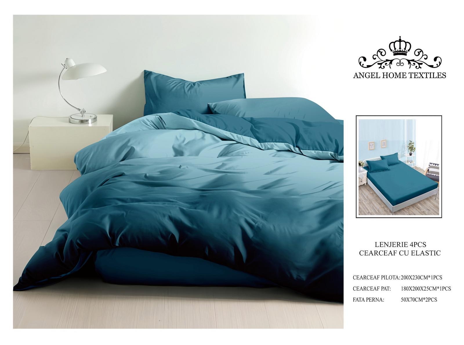 Materialul din care este confectionată lenjeria este de calitate superioara cu o textură fină, moale și foarte placută la atingere. GARANTAT NU SE DECOLOREAZA DACĂ SE RESPECTĂ INSTRUCȚIUNILE DE INTREȚINERE. Produsul este ambalat in husa de plastic transparenta.   Pachetul conține: 1 x Cearceaf pilota: 200 x 230 cm; 1 x Cearceaf de pat: 180 x 200 cm;- CU ELASTIC 2 x Fata de perna: 50 x 70 cm. Lenjeria este ideala pen