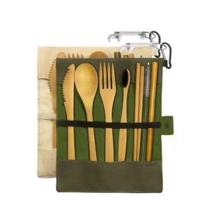 Setul contine doua truse textile fiecare continand tacamuri si ustensile din bambus de cea mai buna calitate:Furculita lingura cutit pai din bambus periuta de dinti periuta pentru curatarea paiului din bambus desfacator de sticleEste un set ideal pentru voiaj camping trusele textile fiind in doua culori una alb crem cealalta verde inchis si decorate cu un fruct de anason stilizat.Produsele sunt ideale pentru a evita folosirea in exces a tacamurilor din plastic de unica folosinta. Tac