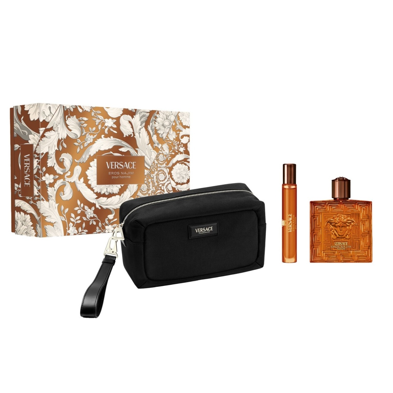 Setul Cadou Versace Eros Najim pentru Bărbați, care include Apa de Parfum 100 ml, varianta travel de 10 ml și o geantă elegantă, este o declarație de putere, magnetism și rafinament intens masculin. Este un parfum care combină seducția orientală cu accentele moderne, creând o aromă profundă, misterioasă și sofisticată — perfectă pentru bărbatul sigur pe sine, care nu se teme să fie remarcat și admirat. Debutul parfumului surprinde printr-o combinație neașteptată și extrem de captivantă: caramel