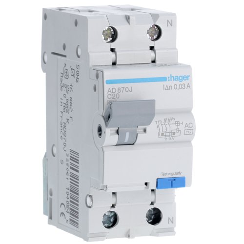 Disjunctor diferential RCBO 1P+N 20A/30mA tip AC Hager AD870J
