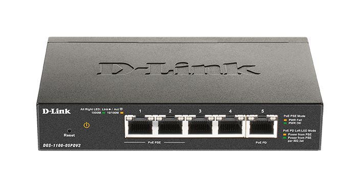 Switch D-Link DGS-1100-05PDV2, 5 porturi Gigabit, 2 x 10/100/1000 Mbps (PoE), 3 x 10/100/1000 Mbps, Switching Capacity 10 Gbps, IEEE 802.3af, 0.38 kg, 150 x 97 x 28 mm, Fanless.Garantie: 60 luni