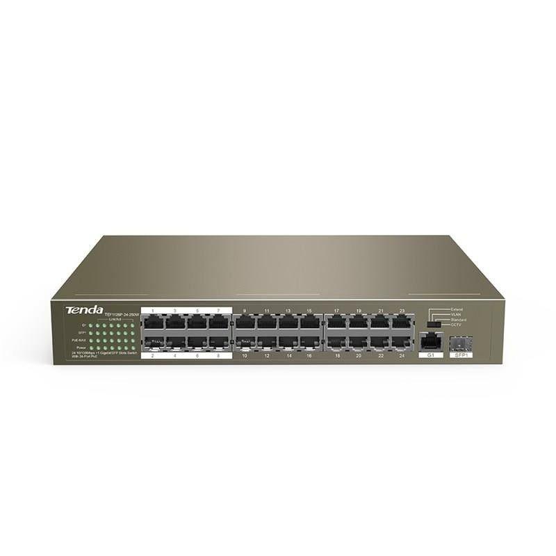 Tenda 24-Port 10/100Mbps + 1ge/SFP, 24 10/100Base-TX ports(Data/Power), 1 10/100/1000Base-T port(Data), 1 1000Base-X SFP port, 8.8 Gbit/s, Packet Forwarding Rate: 6.55Mpps, PoE supply management: Port 1 to Port 16 support IEEE802.3at/af POE standard, Stan